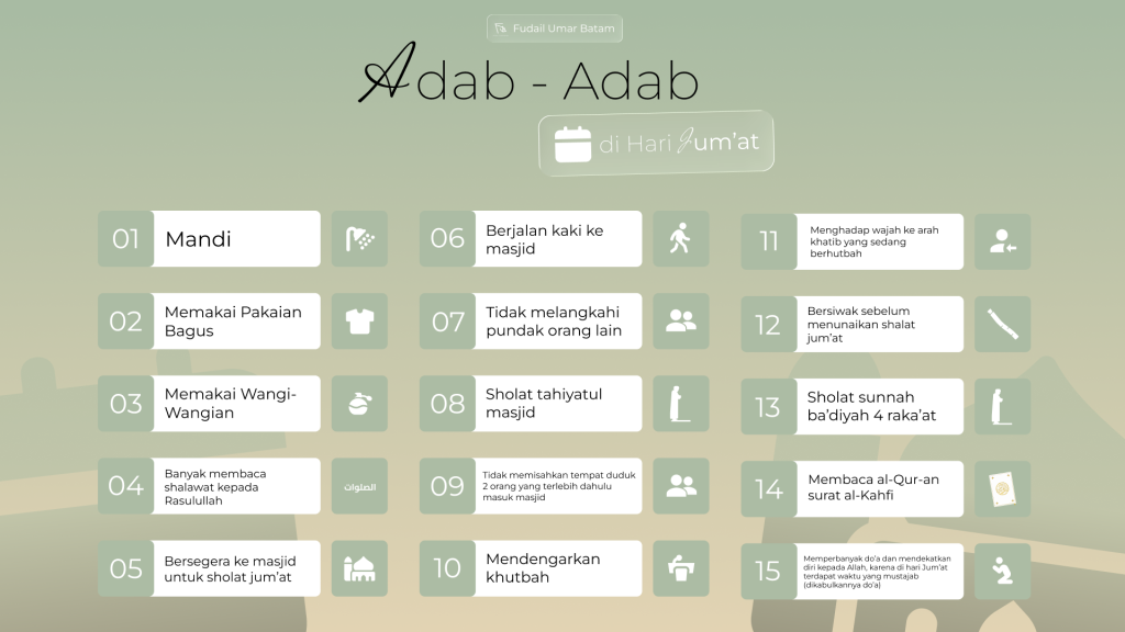 So this is my fiqh project, which is titled “The etiquettes on friday”. so, here i made a mindmapping about the etiquette(s) on friday. there’s 15 etiquettes, from everyday things like taking a shower, then wearing nice clothes and perfume, all the way to more spiritual things like praying tahiyat-al masjid, reciting surah al-kahf, and listening to the khutba’ while facing to the khatib.