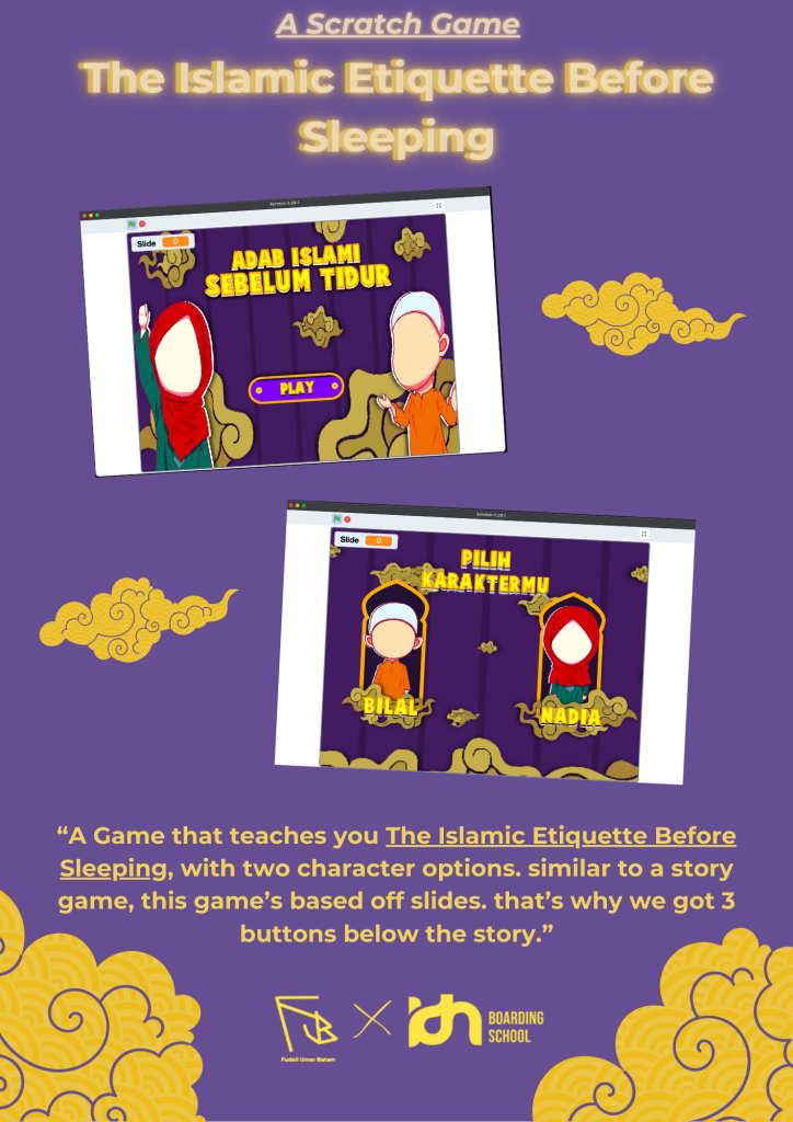 The Islamic Etiquette Before Sleeping, my second game project. Well it’s quite extraordinary.. the gameplay itself’s based off slides, so you get to move the slide either forward or backwards. You also got two character options, Bilal (The Boy) and Nadia (The Girl). They both have 10 slides, so in total you got.. 20 slides. And it’s kinda an educational game? Cuz we’re kinda absorbing information, of course with a proof / دليل (dalil). These informations has various sources, from books, hadists, the noble Qur’an, and more. This game took me a while to make, approximately 3-5 days.