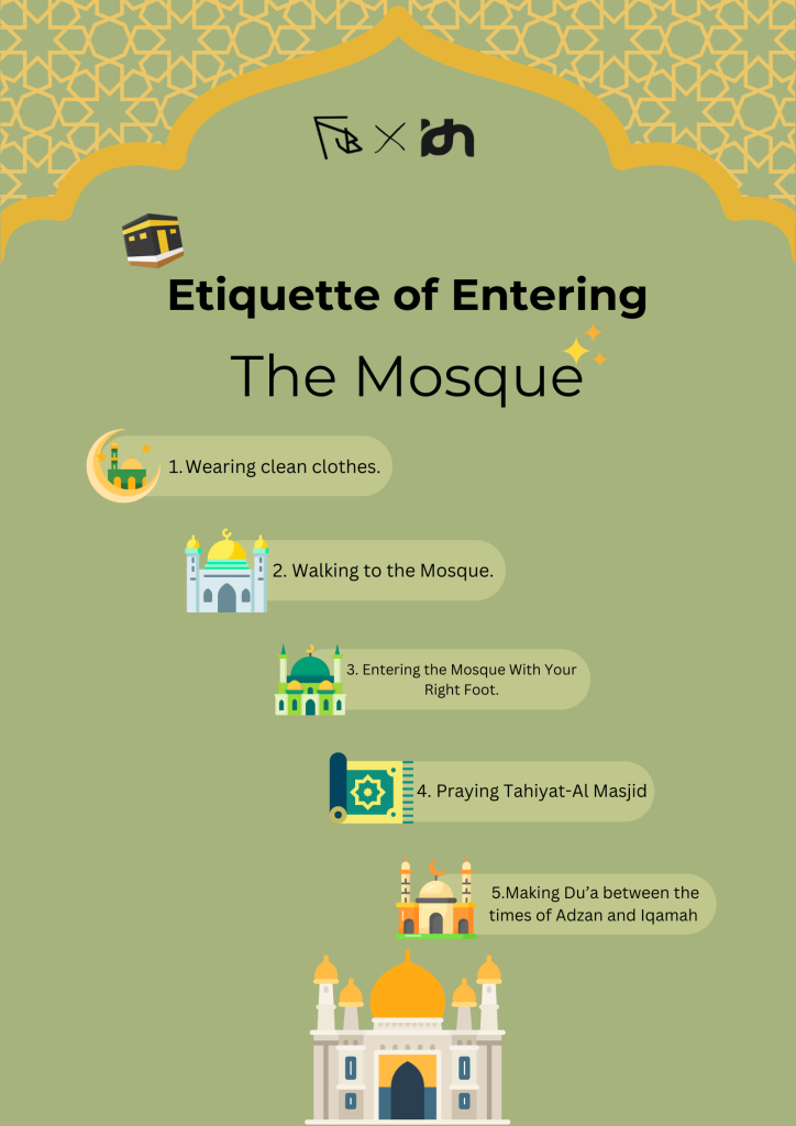 An Adab Project of mine. it didn’t have to really be a specific Etiquette, so I just went with the Etiquette of entering the mosque. took me like 1-2 hours to make. I made this in canva. originally, I wanted to make an Etiquette of Visiting graves poster, but I changed my mind. and also this is my first poster in which I changed my watermark.